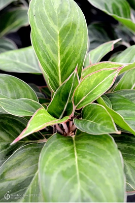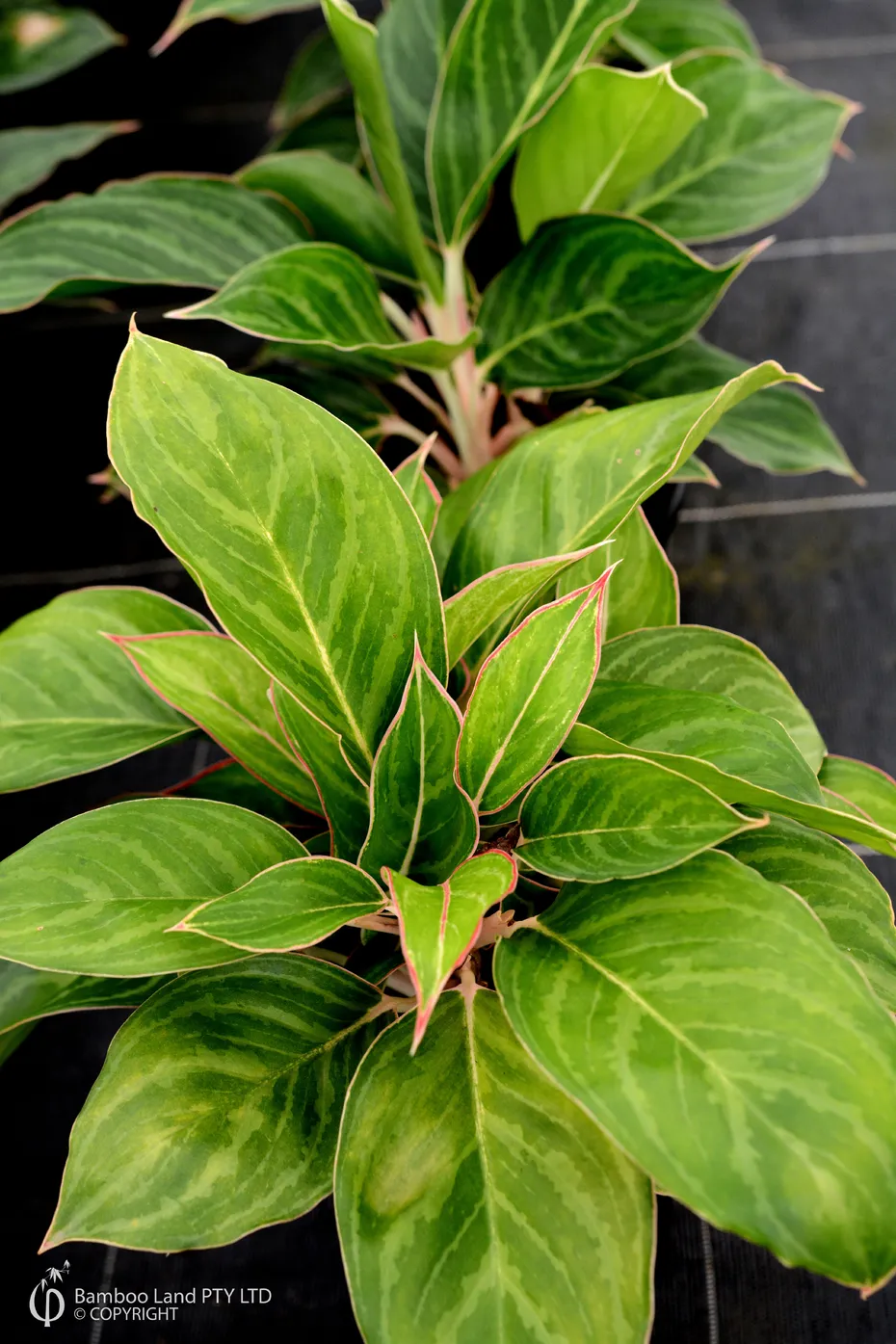 An aglaonema hybrid with dark green leaves with silvery veins and and thin pink edges. A fantastic indoor pot plant or understory plant in warm protected gardens. As an indoor plant, it will do well in poorly lit areas.