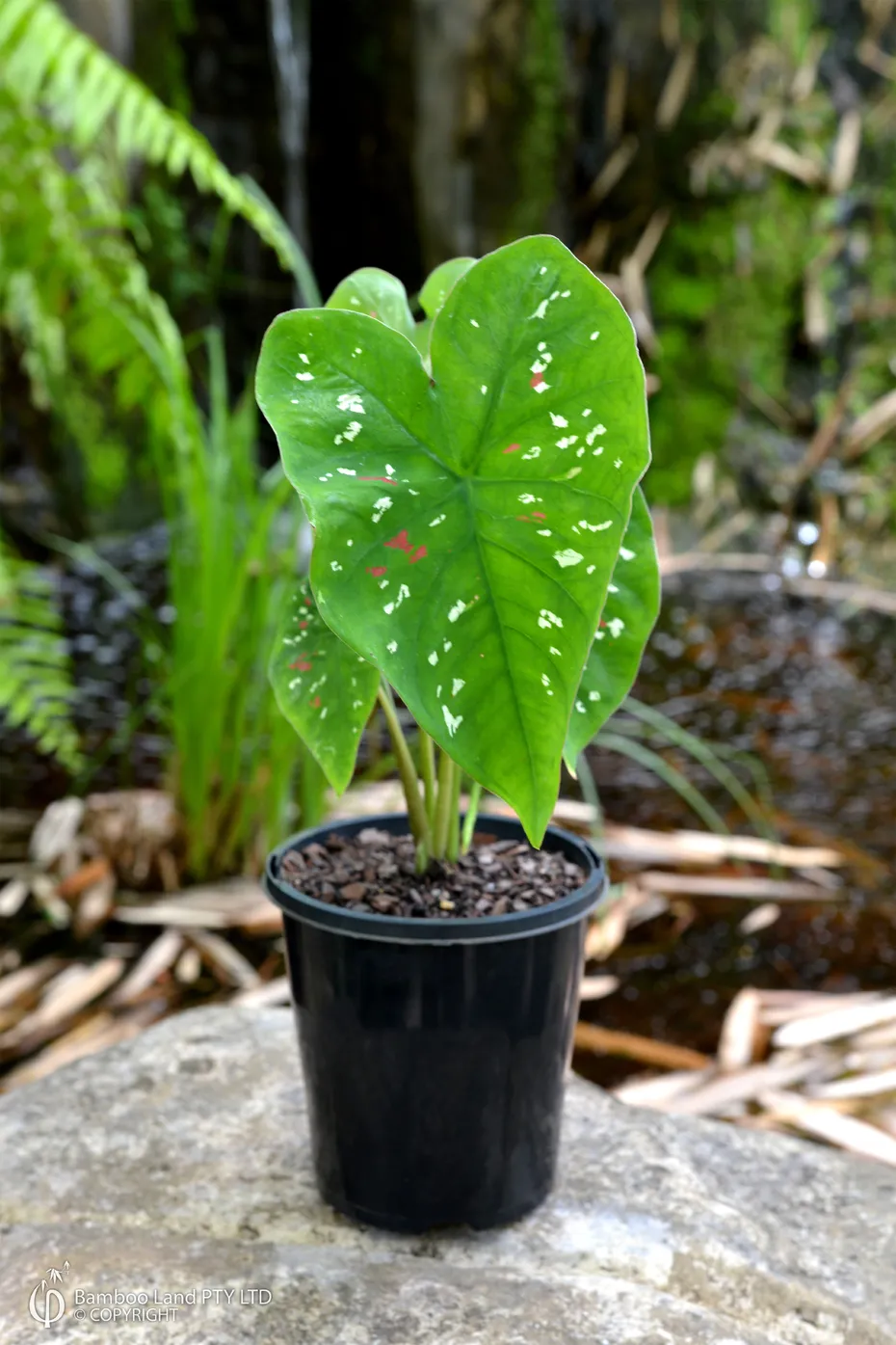 A perennial tuber grown for its colourful foliage. The heart shaped leaves have a combination green, pink, red and white flecks. Will die down during the winter months.