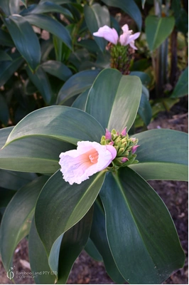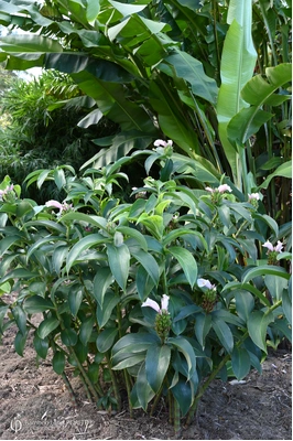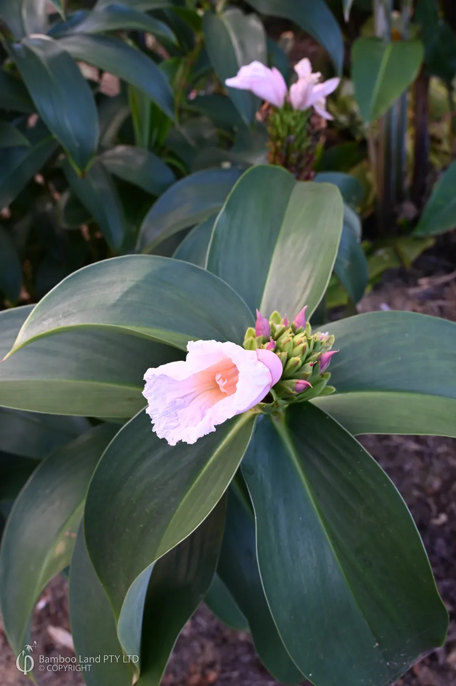 A hardy ginger with pinky white flowers on top of green spiralling stems. An excellent landscaping plant. Deciduous in cool climates.