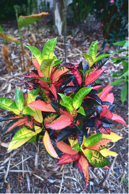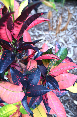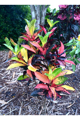 One of the showiest crotons with leaf combinations of pink, lime green, maroon and peach. It will surely brighten any space with it's multitude of flashy colours. Great for mass planting, pots and layering in your garden.