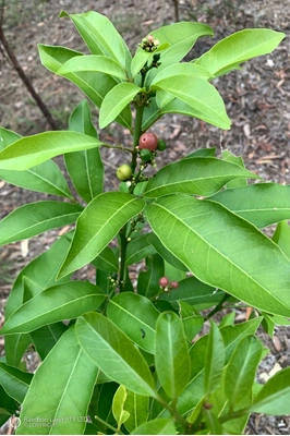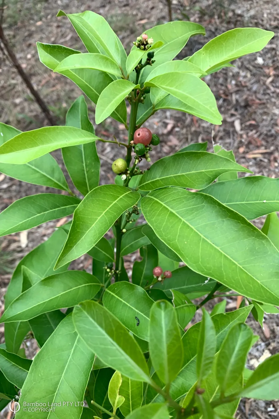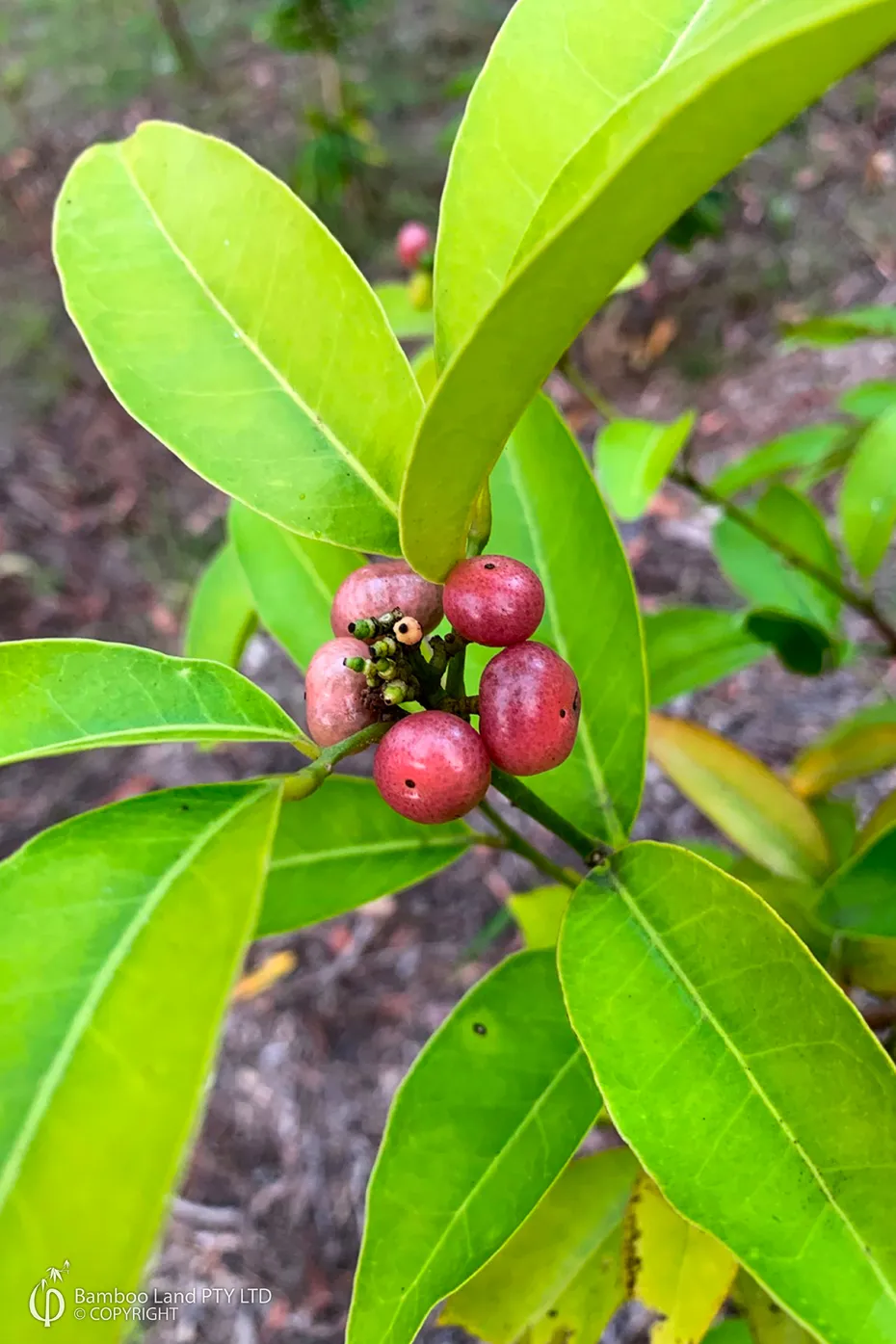 A small, hardy, evergreen ornamental 'bush tucker' shrub with glossy foliage. Small white fragrant flowers which produces pink, juicy and sweet honey flavoured fruits year round.