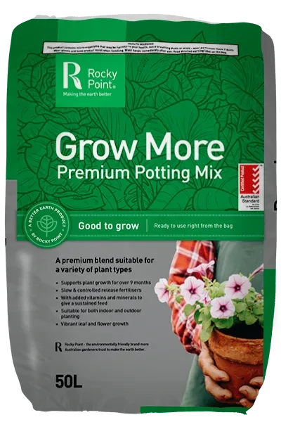 When you’d like to grow more indoor or outdoor plant varieties more successfully, Rocky Point’s Grow More Premium Potting Mix has it in the bag. Simply pop some Grow More into your pots and you’ll soon see how this amazing mix got its name!