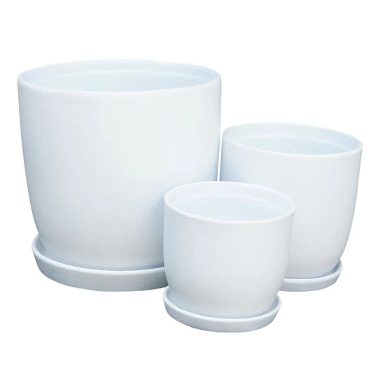 Soft white coloured stone pot. Single drainage hole in the bottom.