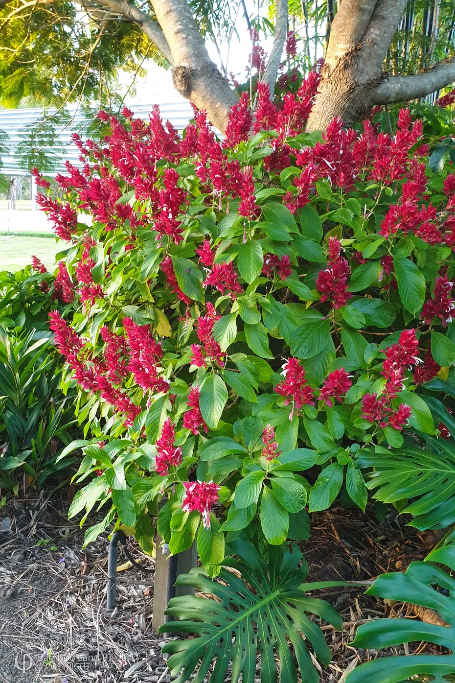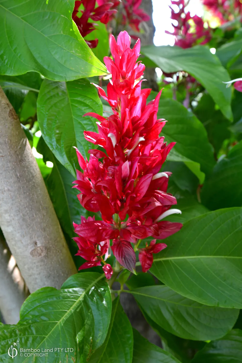 Showy, lush and versatile, this fast growing shrub gives a tropical feel to any garden. The spectacular crimson red bracts with small white flowers emerge sporadically throughout the year with a mass of blooms appearing in Summer through to Autumn.