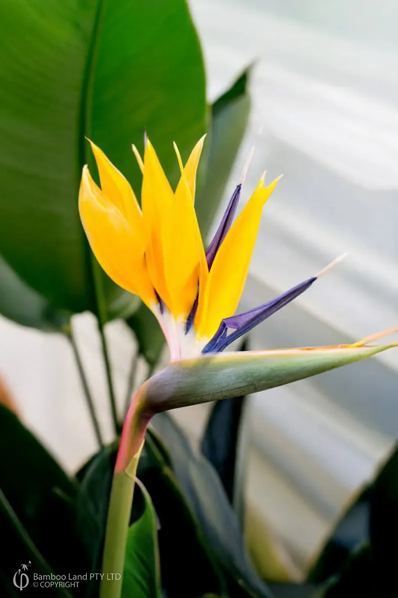 A striking variant of the bird of paradise with bright-yellow and blue flowers held above lush green foliage. Prized for its rare colour, compact habit, and strong architectural impact.